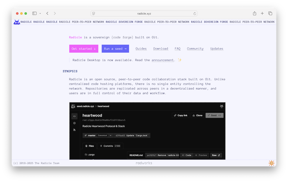 Radicle.xyz is the online home of Radicle, a peer-to-peer protocol designed to help developers collaborate and share code without relying on centralized platforms. According to the platform’s User Guide, the protocol builds on Git, a widely used version control system, to allow repositories, issues, and patches to be replicated directly between users’ devices using cryptographic identities. Each user operates their own node in the network, which helps distribute data and maintain project autonomy. The protocol aims to give contributors complete ownership of their work and data within a distributed network of peers. In June 2025, the team introduced Radicle Desktop, a graphical application designed to make participating in the network simpler and more intuitive.