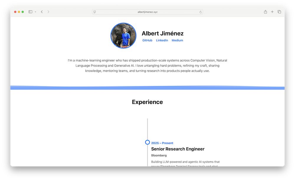 Albert uses his website to share his background, experience, and selected projects in one place. AlbertJimenez.xyz includes an overview of his roles at financial technology company Bloomberg, digital reading platform Scribd, healthcare AI company Triage, and other organizations, along with summaries of his work in search systems, recommendation models, and applied AI products. The website also features talks and research activities, including presentations on AI applications in dermatology and deep learning.