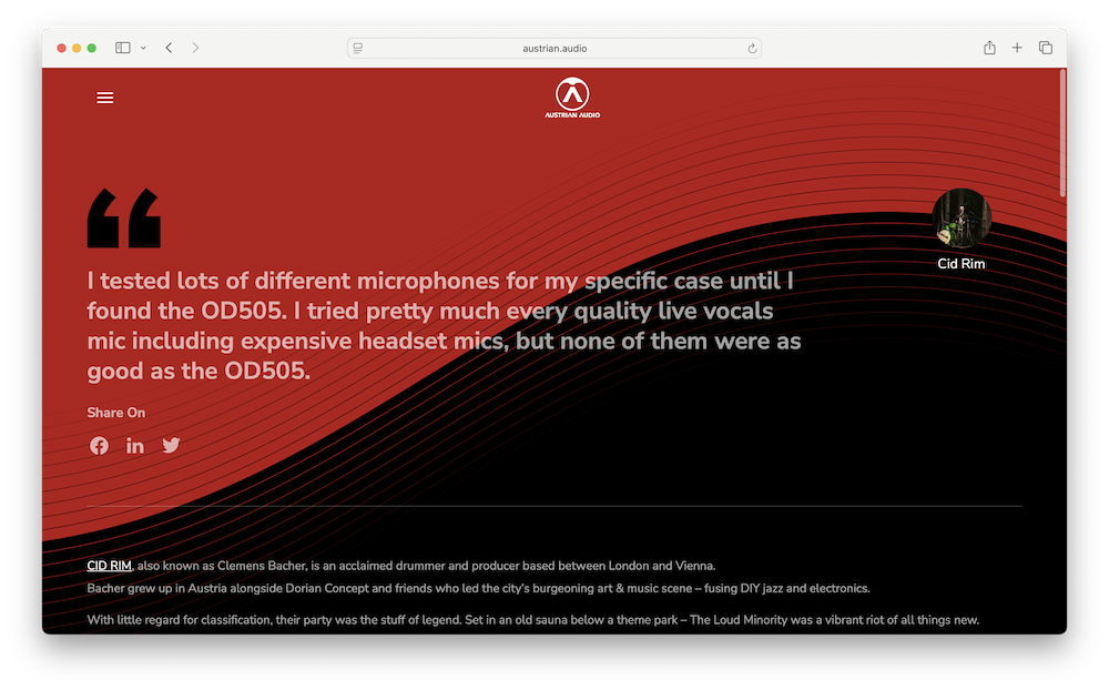 Testimonials on Austrian.Audio are presented as individual “full story” profiles. Each testimonial page combines a first-person quote with background information about the artist or producer, along with details about how specific Austrian Audio products are used in their work. One example features CID RIM, the artist name of Clemens Bacher, a Vienna- and London-based drummer and producer. According to the website, CID RIM describes testing multiple live vocal microphones before choosing the OD505, citing its performance for his specific use case. The profile also outlines his broader musical background and lists the Austrian Audio OD505 and CC8 as part of his setup. He shares, “I tested lots of different microphones for my specific case until I found the OD505. I tried pretty much every quality live vocals mic including expensive headset mics, but none of them were as good as the OD505.”