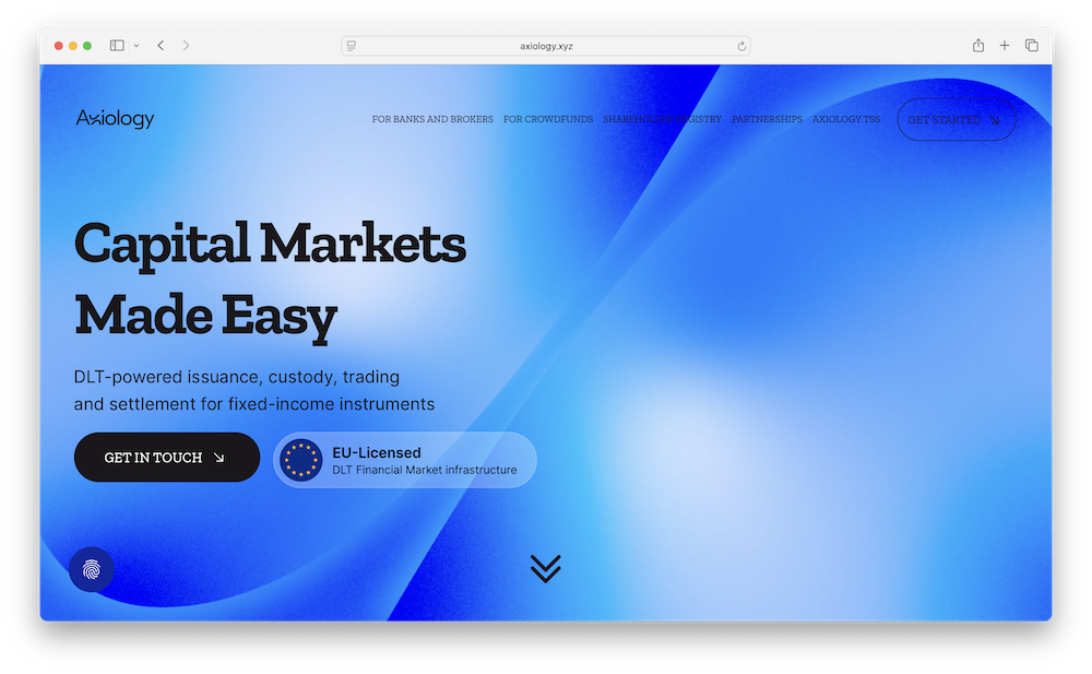Axiology.xyz is the online home of Axiology, a capital markets infrastructure provider that develops systems for issuing, holding, settling, and trading tokenised fixed-income instruments. The company is based in Vilnius, Lithuania, and operates within the EU Distributed Ledger Technology (DLT) Pilot Regime, according to its public materials. According to its LinkedIn profile, Axiology was founded in 2023 and focuses on building regulated infrastructure that supports digital securities activity across European markets. In February 2025, Axiology announced €5M ($5.9M) in seed funding to expand its tokenised securities capabilities and further develop its regulated trading and settlement infrastructure.1