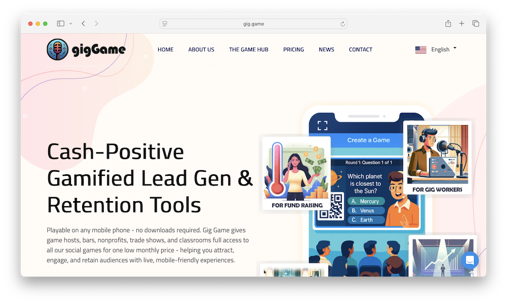 Gig.Game is the online home of Gig Game Corp, a Florida-based company that develops interactive, browser-based games designed for bars, restaurants, trade shows, corporate teams, and fundraising events. According to the website, its platform helps event organizers and business owners turn play into engagement through tools for lead capture, branded content, loyalty programs, and custom ad placements. Each game is designed to be mobile-friendly and fully brandable, requiring no downloads to join. On October 25, 2025, the company announced the release of QR Mobo Bingo, a new event-based game that uses QR codes to encourage attendee participation and increase booth engagement at trade shows.