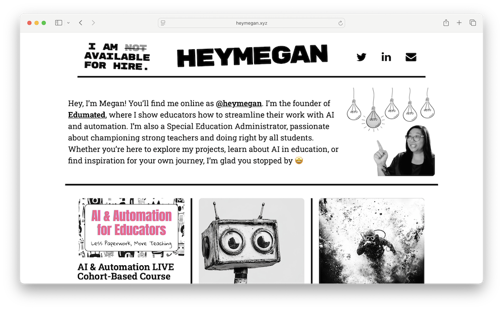 HeyMegan.xyz is the personal website of educator Megan Hsu, who also founded Edumated, which she describes as an initiative focused on helping educators learn to use AI and automation in their workflows. According to the website, she focuses on helping teachers and school staff explore how AI and automation can support lesson planning, documentation, and communication. Megan’s website introduces her background, links to project pages, and outlines her approach to sharing practical strategies for classroom environments. According to her website’s availability indicator, she is available for hire at the time of writing (November 24, 2025).