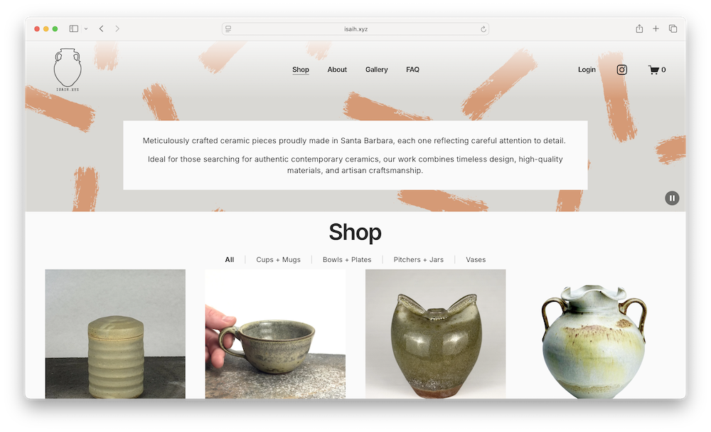 Isaih’s homepage doubles as an online shop, where visitors can browse ceramic categories such as cups and mugs, bowls and plates, pitchers and jars, and vases, with items available for purchase unless marked as sold out. Selecting an item opens an individual product page that provides practical information about the piece, including its intended use, dimensions, approximate capacity, and care instructions. For example, a Tea/Espresso Cup listing notes its use for tea or espresso, lists measurements and capacity, and specifies that the piece is dishwasher- and microwave-safe, while noting that individual items may vary. According to the FAQ, all pieces are thrown on the potter’s wheel and glazed by hand by Isaih himself, and his ceramics are dishwasher- and microwave-safe. Isaih.xyz also addresses practical questions about international shipping, private lessons, and where his work can be found locally. His gallery page showcases past work, with each image accompanied by detailed alt text describing the object’s form, glaze, and texture. Adding alt text (short for “alternative text”) is one of the simplest ways to make a website easier to use, as it provides written descriptions of images so screen readers can convey visual details to visitors who rely on assistive technology. For example, one gallery image includes the description: “A ceramic vase with a narrow bottom that widens towards the top, featuring two small handles on either side and a textured, ribbed design on its surface,” which adds a layer of clarity and professionalism. The About page also embeds posts from Isaih’s Instagram account, giving visitors a closer look at his creative process and how individual pieces are made.