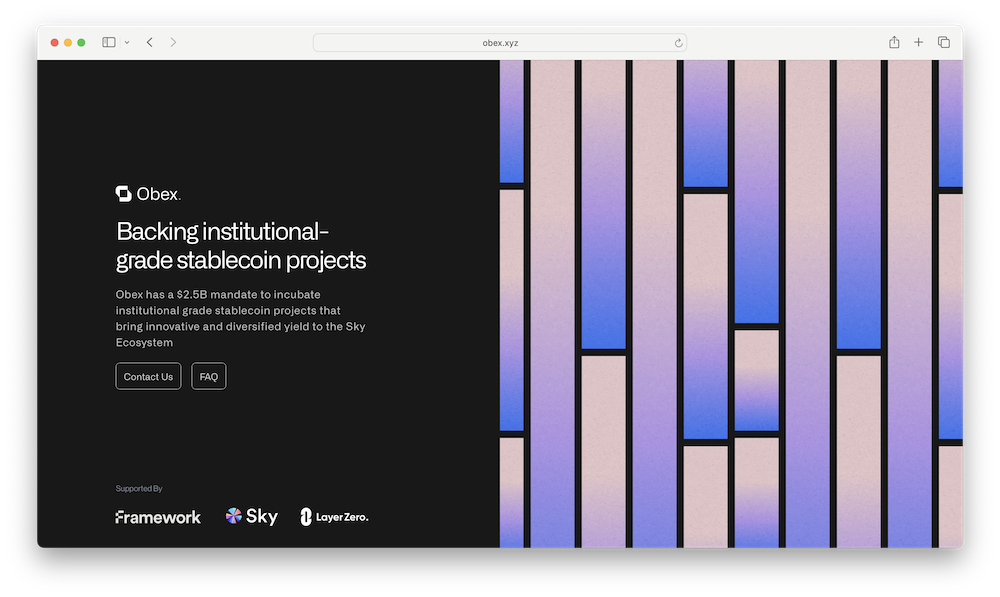 Obex.xyz is the online home of Obex, a stablecoin incubator designed to support early teams developing yield-generating stablecoins built on real-world asset strategies. The program offers a structured environment where participants work on stablecoin models backed by categories such as compute credits, energy assets, or fintech lending. Sky (the entity formerly known as MakerDAO and the issuer of the USDS stablecoin) participates in the initiative and provides access to its resources, while Framework Ventures helps administer the incubator. In November 2025, Obex raised $37M from Framework Ventures, LayerZero, and Sky and can access up to $2.5B worth of Sky-authorized USDS for selected participants. The initiative is described as aiming to operate as a Y Combinator style program for stablecoin projects.1