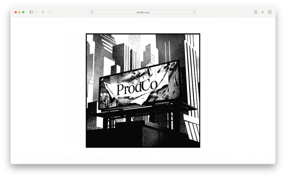 ProdCo.xyz is the online home of ProdCo, a production company working across commercial, music, and fashion film. According to the Advertising Producers Association (APA) member listing, the company was founded in 2023 with offices in London, England, and Los Angeles, California.1 ProdCo’s work spans collaborations with brands, agencies, and artists across multiple disciplines. In May 2025, it was reported that filmmaker Frank Lebon signed with ProdCo for commercial representation.2