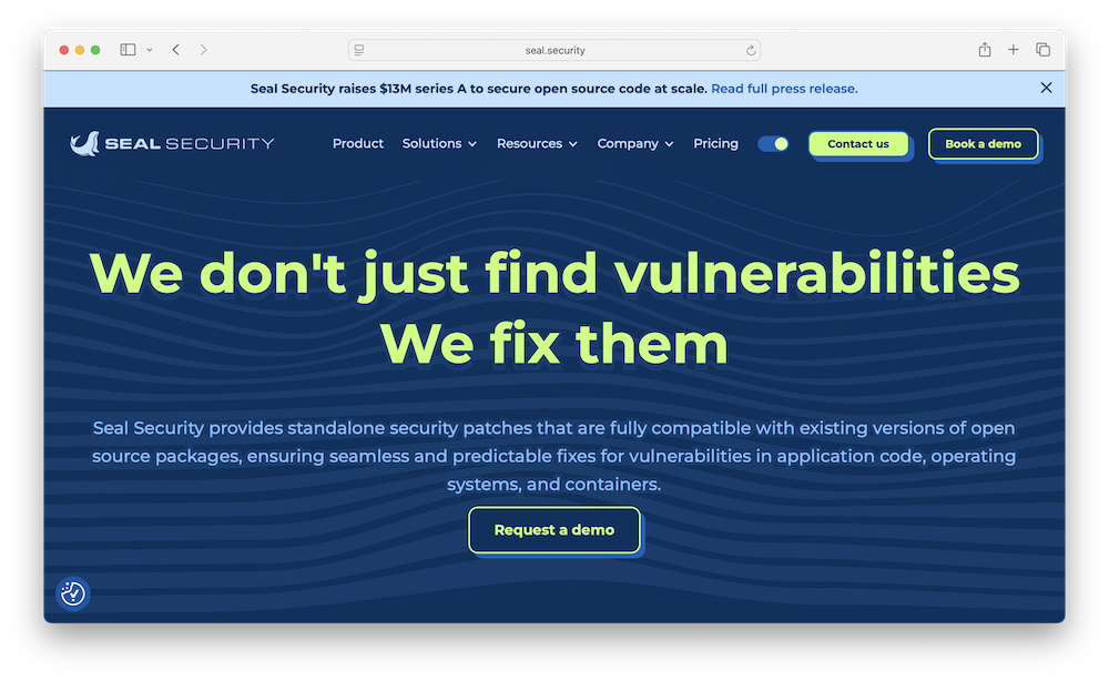 Seal.Security is the online home of Seal Security, a Tel Aviv, Israel–based cybersecurity company founded in 2022. The platform was developed by three software vulnerability specialists with over 30 years of combined experience, and positions itself as the first generative AI solution for automated, scalable remediation of open source vulnerabilities. In July 2025, Seal Security raised $13M in Series A funding led by Vertex Israel, with participation from More Investments, SBI Group, and CCL, bringing its total funding to $20M.3