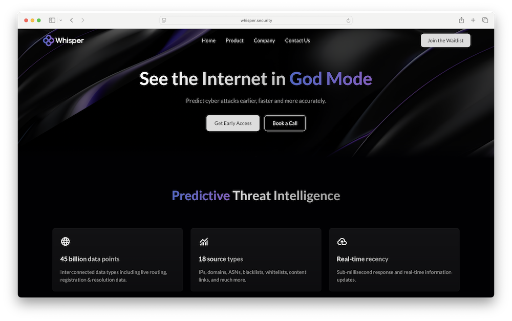 Whisper.Security is the online home of Whisper, a cybersecurity platform founded in January 2025 in Amsterdam. The company states that it provides real-time visibility into internet infrastructure to help predict cyber attacks earlier, reduce false positives, and enhance AI-driven security operations. In July 2025, Whisper raised €1.6M (approximately $1.75M) in pre-seed funding. The round was led by Atlas AI^VB Fund I, with participation from Antler, D11Z, Tioga Trust, and Volve Capital.1