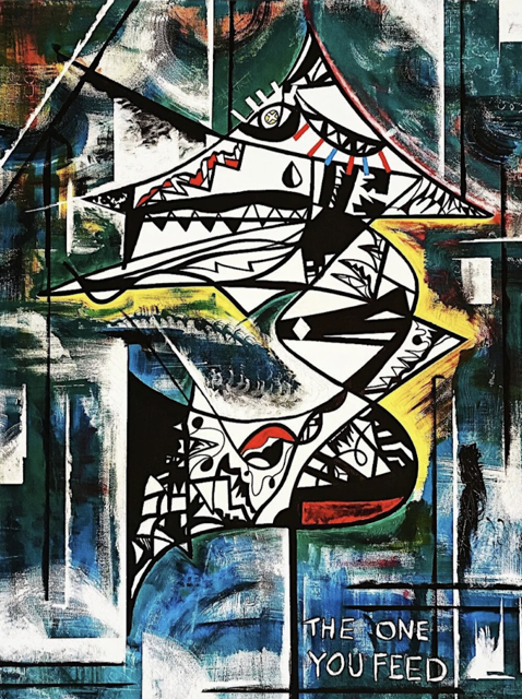 The website presents a structured overview of her multidisciplinary work across several sections, including projects, speaking, art, and music releases. It highlights her 2025 album Dark Therapy, which she describes as “a neuroarts project exploring how darkness, sound, and stillness can support healing and self-discovery.” As highlighted on the album’s page, the work was created in collaboration with neuroscientists and incorporates elements such as spatial sound and sensory-based experiences. SUUVI.xyz also includes documentation of live performances, film collaborations, and interdisciplinary projects involving dance companies and cultural institutions. For example, her projects section includes a March 2025 presentation at Google X, described as “an immersive keynote and live performance examining the convergence of neuroarts and cultural identity.” The art section includes visual works that reflect her multidisciplinary approach. One example is a mixed-media composition combining abstract geometric forms, layered textures, and bold color contrasts, with fragmented facial elements and expressive linework arranged across the canvas. The piece incorporates text reading “The One You Feed,” alongside contrasting shapes and tones that create a visually complex, collage-like structure.