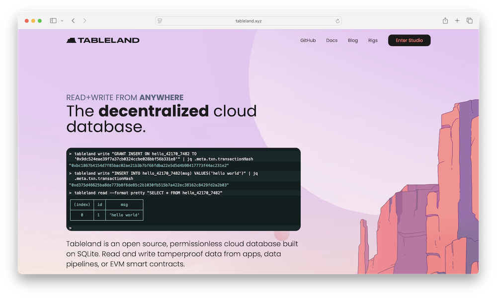 Tableland.xyz is the online home of Tableland, a permissionless, serverless relational database network designed for web3 applications. According to its documentation, Tableland helps developers store and query structured data, such as information organized in rows and columns, using SQL (a widely used language for working with databases). Table creation and data updates rely on blockchain-based access control, meaning permissions are enforced through onchain accounts. Tables are created on supported blockchains and owned by those accounts, while read queries are handled offchain through the Tableland gateway, allowing applications to retrieve data without requiring a blockchain transaction. In April 2023, Tableland announced an $8M Series A funding round led by CoinFund, with participation from Multicoin Capital, Blueyard, and A Capital.1