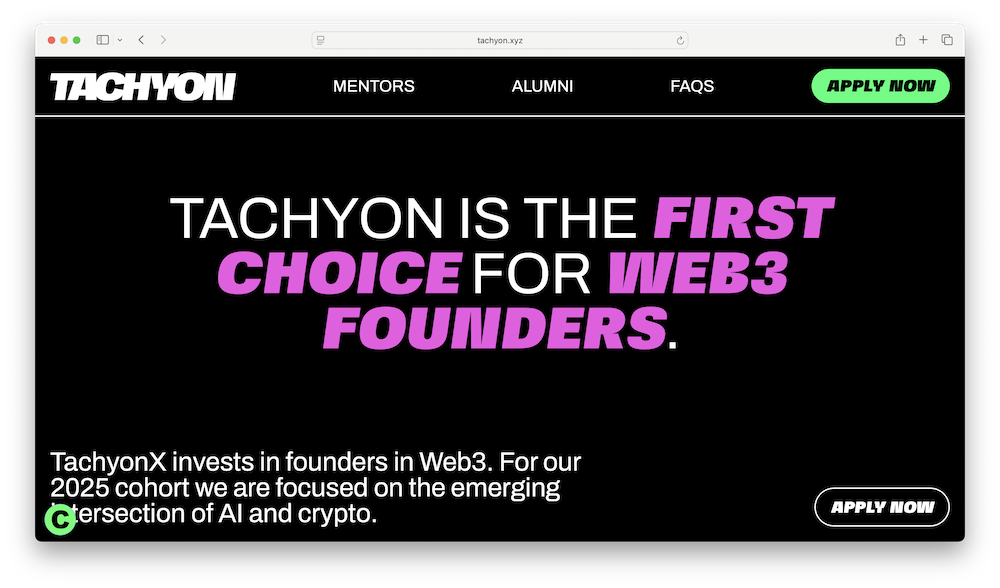 Tachyon.xyz is the online home of Tachyon, a program that supports early-stage founders building at the intersection of blockchain and artificial intelligence. Since 2017, Tachyon has launched six programs and worked with dozens of alumni teams. Its TachyonX initiative is designed for very early-stage founders. After an application and short interview process, Consensys Mesh invests $150,000 in accepted companies. Consensys Mesh, also referred to as Mesh, plays a key role in advancing decentralized technologies through investment, incubation, research, and acceleration programs. Founded by Ethereum co-founder Joseph Lubin, Consensys Mesh exists within the broader Consensys ecosystem that helped launch Ethereum and develop MetaMask, one of the most widely used crypto wallets. TachyonX is not structured as a cohort-based accelerator. Instead, it provides funding, mentorship, and hands-on support tailored to each company.
