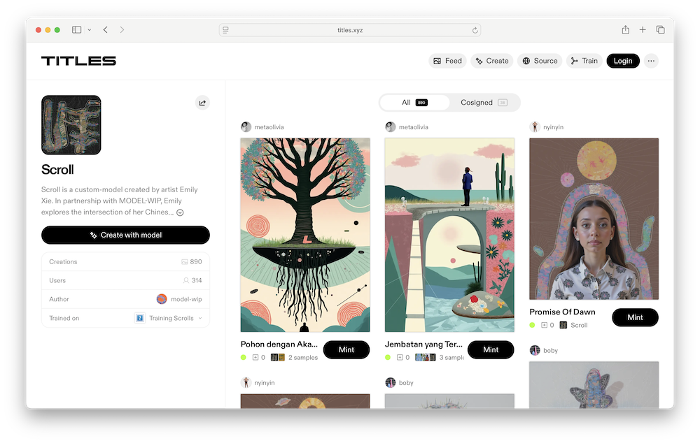 One featured example is Scroll, a custom model created by Emily Xie. According to TITLES.xyz, the model was trained on visual material developed in partnership with MODEL-WIP, an artist commission group, where Emily explores her Chinese-American heritage. Broken seal script characters are transformed into intricate digital quilt-like forms, which serve as the foundational training data. The project illustrates how TITLES models can reflect a specific artistic process and cultural context, rather than producing generic visual outputs.