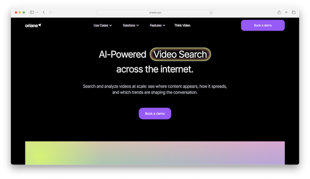 Oriane.xyz是总部位于英国伦敦的初创公司Oriane.xyz的官网,该公司正在开发一个 AI 视频搜索引擎,服务于他们所定义的“视频优先的互联网”——这是一个以短视频和流媒体为主要交流和内容形式的时代。该平台的目标是帮助用户追踪并分析视频在各大平台上的传播路径,洞察视频被转发、侵权使用和互动趋势等情况。2025 年 9 月,Oriane 成功融资 150 万美元,用于推进其多模态 AI 技术,并扩展其在伦敦、巴黎、巴塞罗那以及美国的业务。同年 10 月 1 日,公司推出首期官方通讯《Think Video》,面向视频搜索与分析领域的专业人士,分享行业洞察与数据分析。