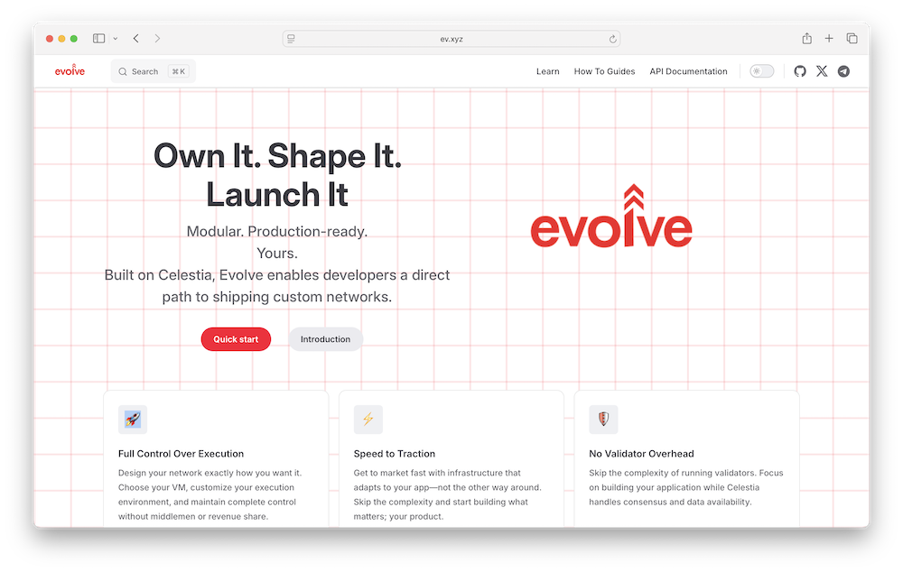 在更广泛的区块链生态系统中,Evolve 将自己定位为一种基础设施,服务于那些希望获得比智能合约通常所允许的更多控制权、但又不想承担传统Layer 1部署的运营负担的团队。该平台构建于 Celestia 之上,利用其数据可用性和共识模型,同时将执行保持在链下。这种方法将执行与数据可用性分离,旨在支持可扩展性、定制化和更快的迭代。Evolve 是开源且模块化的,有助于开发者复用组件或与现有的执行环境(例如基于 Cosmos SDK 的应用或与以太坊兼容的运行时)集成。